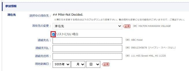 滞在先がリストにない場合は「滞在先の変更」の下にある「リストにない場合」をチェックいただき、英語で、「滞在先名」、「連絡先電話番号」、「滞在滞在先住所」を記載の上、変更内容を登録ください。