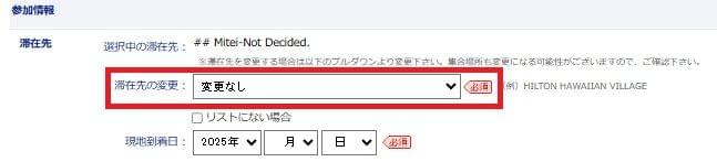 基本は可能です。 お申し込みを進めていただき、参加情報の滞在先の欄の「リストにない場合」にチェックを入れていただき、TBAやMITEIと登録の上ご予約お願いいたします。 また、決定後には必ず予約詳細画面よりホテル名を登録お願いいたします。 リストにない場合は、チェックボックスにチェックを入れていただき手入力をお願いいたします。 (一部、ご予約時に出発地区を選択いただく必要のある商品があります。その場合はホテル確定後にお申し込みお願いいたします。)